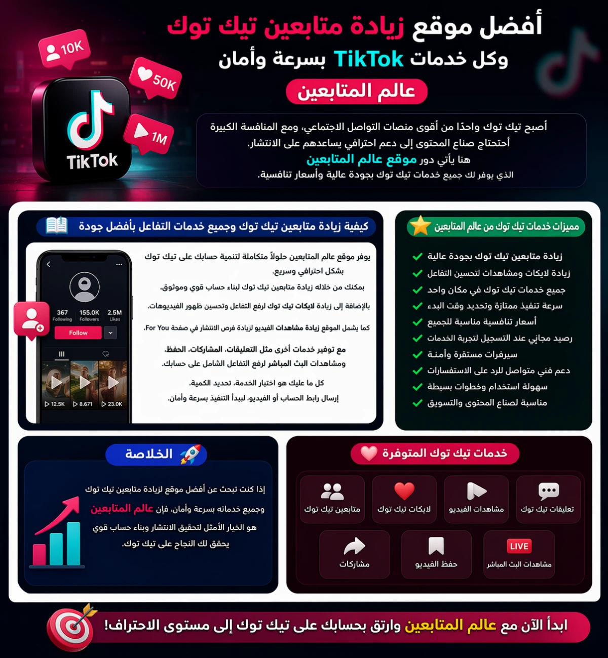 - خدمة زيادة لايكات ومشاهدات تيك توك لتحسين أداء الفيديوهات وزيادة فرص ظهورها في صفحة For You على TikTok.