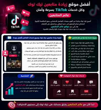 يوفر موقع عالم المتابعين باقة شاملة من خدمات TikTok التي تناسب الأفراد، صناع المحتوى، المتاجر، وأصحاب العلامات التجارية، حيث يمكنك من خلاله زيادة متابعين تيك توك، لايكات تيك توك، مشاهدات الفيديو، المشاركات، الحفظ، التعليقات، وزيادة التفاعل على البث المباشر بطريقة آمنة وسريعة تساعد حسابك على النمو بشكل طبيعي. هذه الخدمات تساهم في تحسين المصداقية الاجتماعية للحساب، وزيادة فرصة ظهور الفيديوهات في صفحة For You، مما يرفع من معدل الوصول والمشاهدات بشكل ملحوظ.